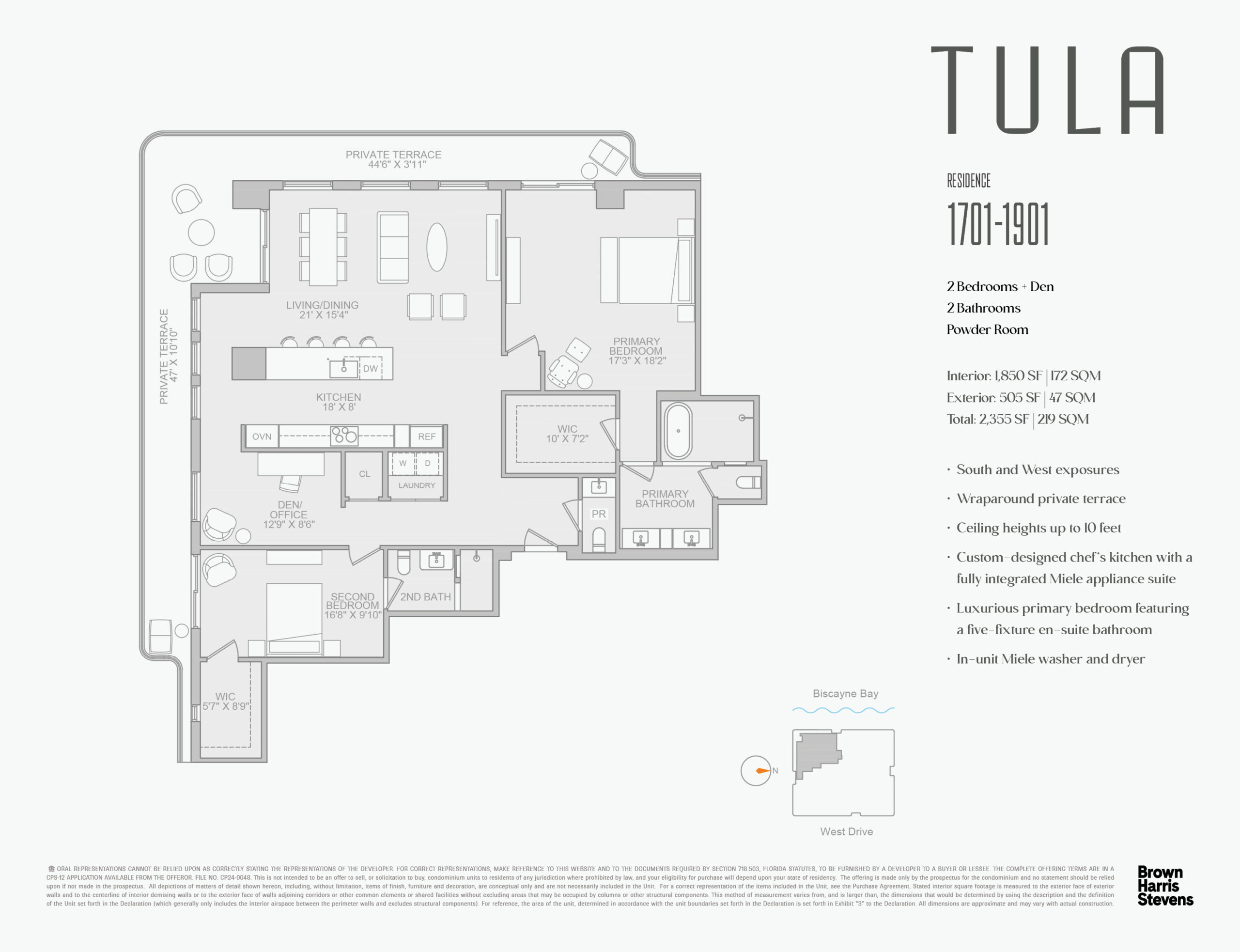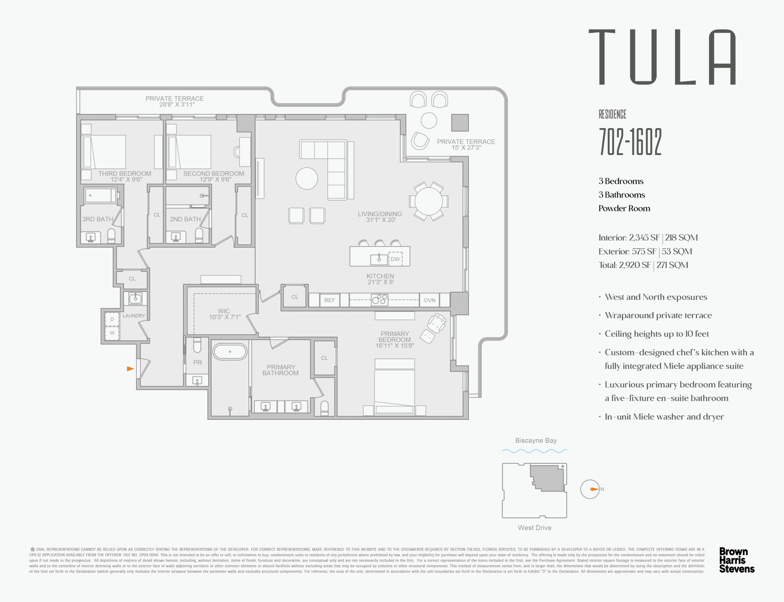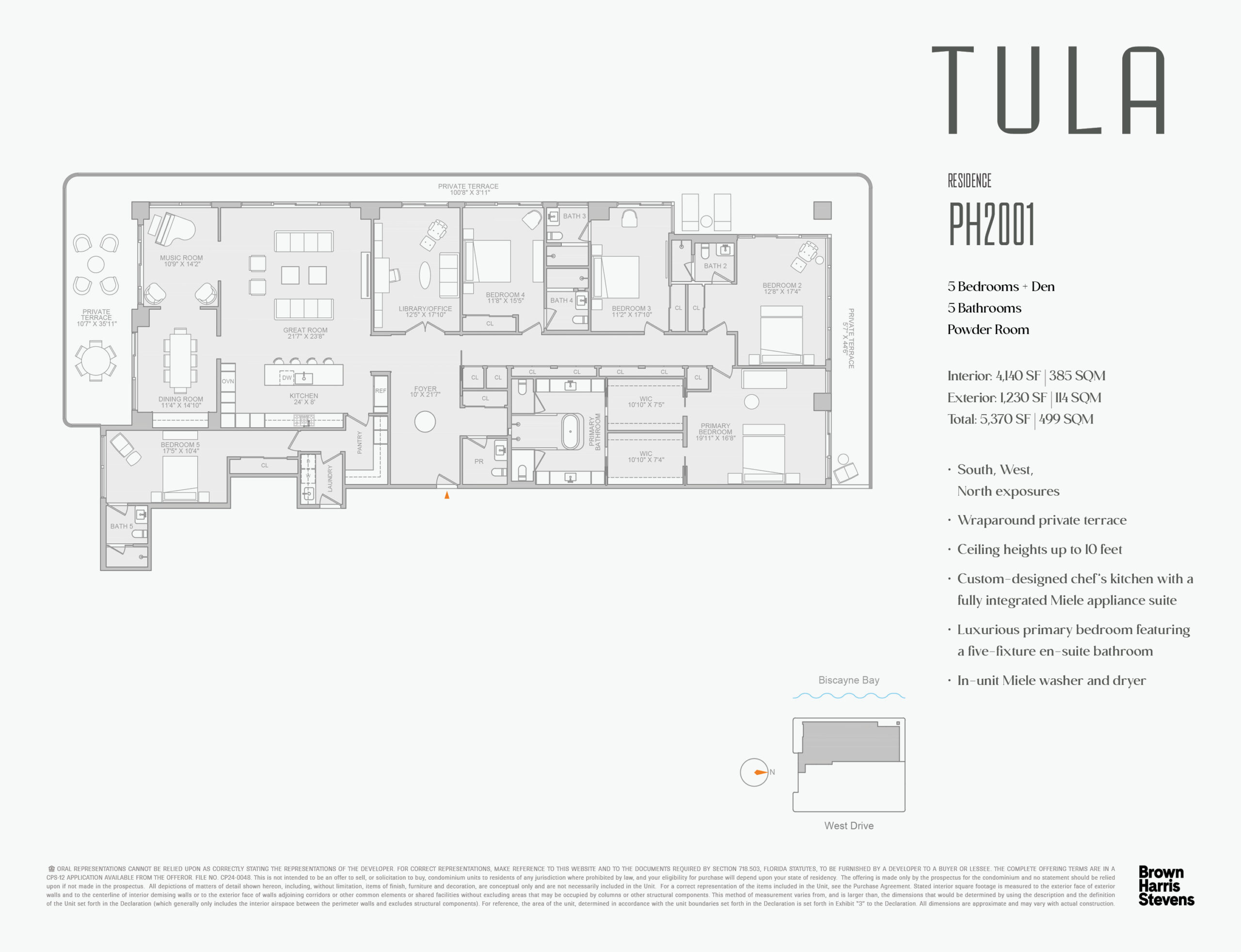 TULA Residences is an exclusive boutique luxury waterfront condominium featuring 54 two-to-three-bedroom corner residences and six five-bedroom half-floor penthouses. Each home boasts efficient floor plans, organic-inspired interiors, 10-foot ceilings, custom Italian chef’s kitchens, floor-to-ceiling windows, and private glass-enclosed terraces. Residents enjoy stunning, unobstructed panoramic views of Biscayne Bay, Miami’s skyline, and the Atlantic Ocean. Exceptional amenities include a resort-style infinity pool with cabanas, fitness and wellness center, media room, lounge, pet spa, parking garage, and 24-hour concierge, with delivery anticipated in October 2026.